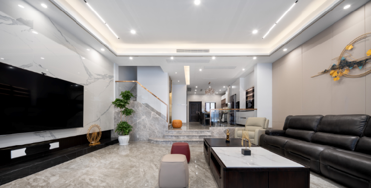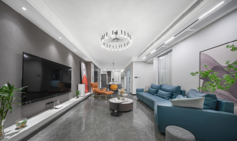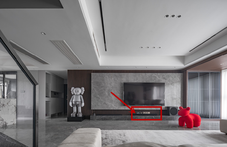 客厅是家庭的公共区域,也是主要的待客空间。很多业主在电视墙设计上希望体现时尚、气派和精致,于是将大理石、格栅、金属、悬空电视柜等各种元素全部堆叠在一起。